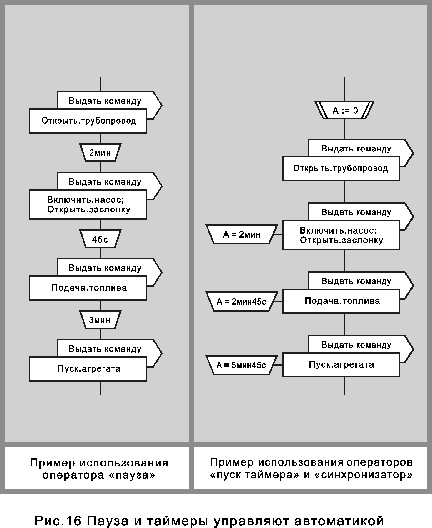 Картинка на рисунке справа с хитростью. Ибо может как засыпать на время паузы, так и возвращать управление. Во втором случае я могу ОДНОВРЕМЕННО выполнять другие действия, например, управлять вторым комплектом автоматики. И даже ... разместить на одной схеме