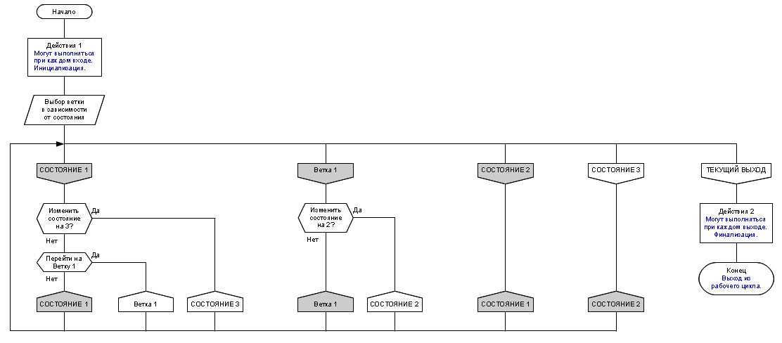 В одном рабочем цикле передача управления с ветки на ветку возможна только для веток не имеющих слова СОСТОЯНИЕ в названии и только для веток, находящихся между двумя соседними ветками СОСТОЯНИЕ.