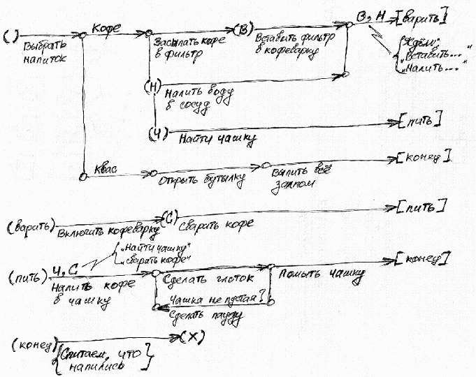 - неудачно вписан "драконовский силуэт": когда выходишь из крайней правой подписанной вершины - "адреса" ветки, то интуитивно двигаешься вниз, а ведь надо вверх (по схеме). Да, и в целом, линии силуэта, имхо, тут лишние. Лучше как в первом рисунке (в начале темы форума), здесь вполне нормально воспринимается комплект схем (т.е. набор отдельных веток силуэта), которые повязаны друг с другом через переходы. Имхо, силуэт полезен в случаях, когда необходимо явно показать бесконечный цикл, например. Да и как его показывать, этот силуэт, ещё нужно покурить над ним.