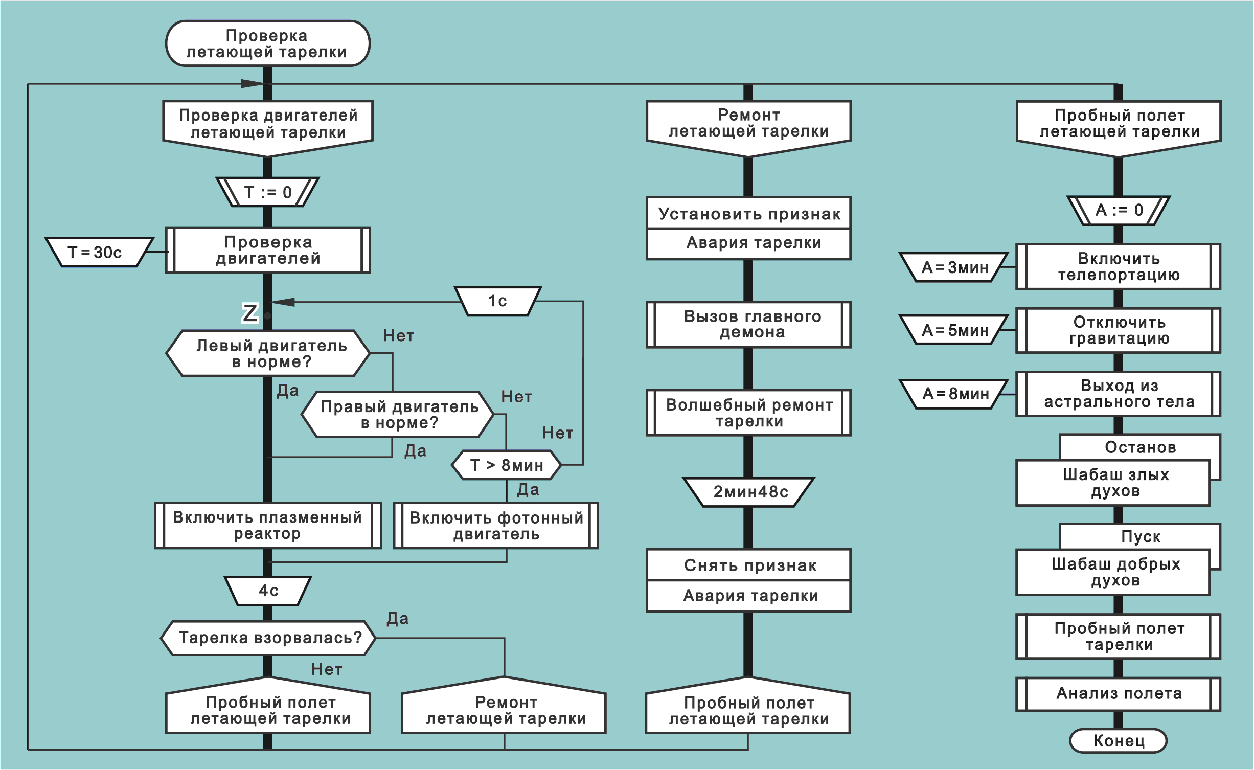 1) Почему проверка двигателей должна выполняться именно на 30-ой секунде? Получается, мы просто в начало работы алгоритма добавили паузу в 30 секунд? Какой в этом смысл? Может, стоит добавить простую икону "пауза 30сек" перед "проверкой двигателей"? И тогда можно перенести "сброс таймера T:=0" ниже. Ну, чтобы хотя бы обозначить "отсчитываем 8 минут вот от сих пор (от T:=0), и до сих (до T<8мин)".