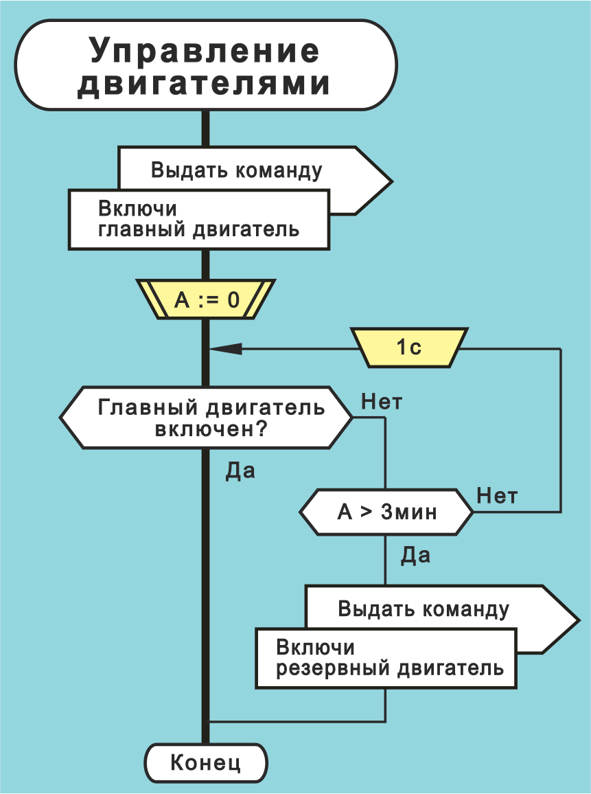 Задача. Включить главный двигатель. Если через 5 минут он не включится, следует включить резервный двигатель