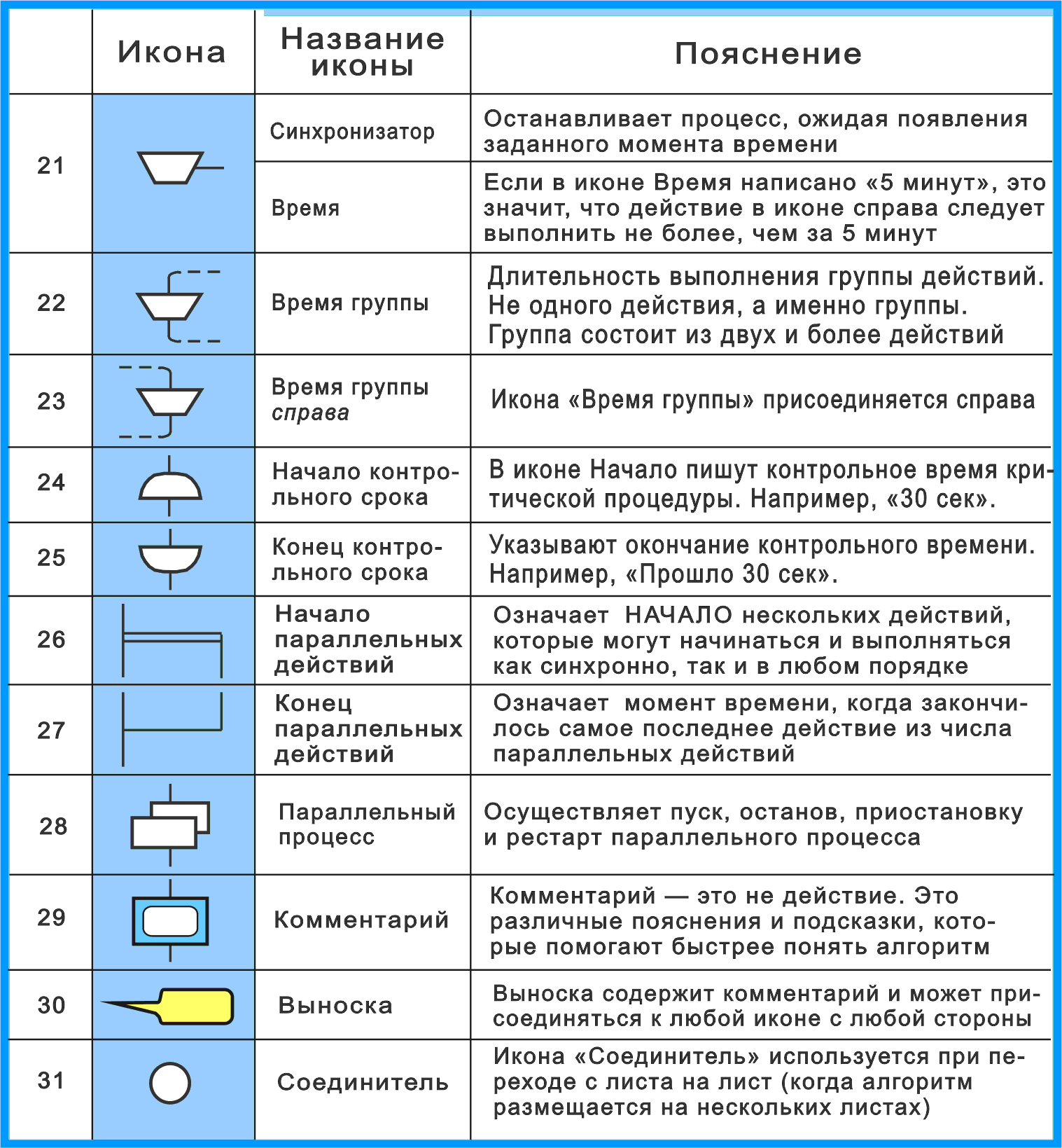 У пункта 21 "цикл со стрелкой по таймеру" непонятен смысл. В описании говорится "задерживает выполнение цикла". Задерживает что именно? Проверку условия? Или переход по стрелке? А, если на стрелке какие-то действия? Сначала выполняем их, потом задерживаем возврат в начало цикла? Или как?