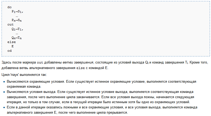 Если добавить обратные дуги, то цикл станет "пауком". Но т.к. нет обратных дуг, т.е. явных выходных условий, в данном случае они не важны, то Р-машина делает "поблажку", и если цикл не может продолжаться или даже начаться, то не считает структуру непроходной и топает дальше. А если имеется "Е", т.е. обратная дуга без предиката, то при любом исходе цикла машина вынуждена её исполнить, т.к. прямые дуги не могут больше выполняться, и обратных дуг-конкурентов нет.