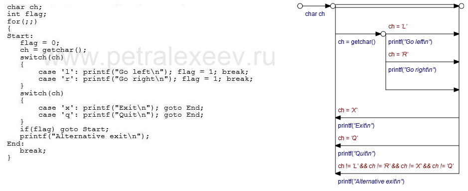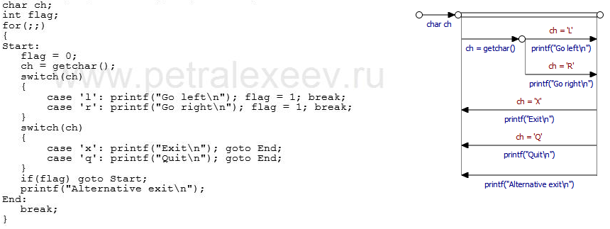 Здесь не совсем так. Первая дуга является составной, и, по сути, условие вхождения отсутствует, а вот далее идет вложенная структура, которая, в отличии от примера, может быть не проходимой, если ch не равна ни "L" ни "R".