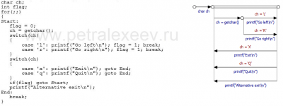 Нужно обратить внимание, что я под "запуском дуги" подразумеваю исполнение дуги как целостной структуры, т.е. дуга - есть вложенная структура, со всеми своими связями (последоват. и пр.), и ее успех выполнения требует успешное выполнение всех составных для неё структур. В примере при анализе предикатов обратных дуг символ "ch" будет всегда определён, т.к. "getchar()" отработает несмотря на успешность всей прямой дуги (или структуры).