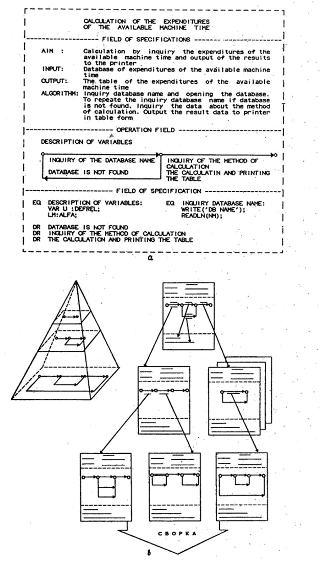 Этап документирования в традиционном его понимании отсутствует в Р-технологии, ибо комплект чертежей программного проекта по ГОСТ 19.005-85 (ISO 8631Н) полностью заменяет документ "Описание программы" по БСПД. Эксплуатационная же документация проекта (инструкция для пользователя, оператора и др.) получается не изготовлением заново, как обычно, а редактированием и автоматизированной генерацией из поля спецификаций соответствующего комплекта чертежей. Объем ее меньше традиционного, так как содержит только основные, самые необходимые для эксплуатации системы сведения, а за остальными пользователя отсылают к соответствующему комплекту чертежей проектной документации. Проектная и эксплуатационная документация создается по унифицированным технологическим операциям, содержащим соответствующие шаблоны и трафареты, что облегчает ее понимаемость и усваиваемость.