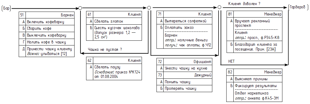 В общем, как-то нужно не допускать ощущения, что вместо подписанного графа мы имеем текст, помещенный в какую-то таблицу. Схемка из прошлого поста (с табличками) наводит на мысли попробовать таблицы с "волнистыми" линиями в стиле IDEF..., или без внешних рамок, что-то вроде: