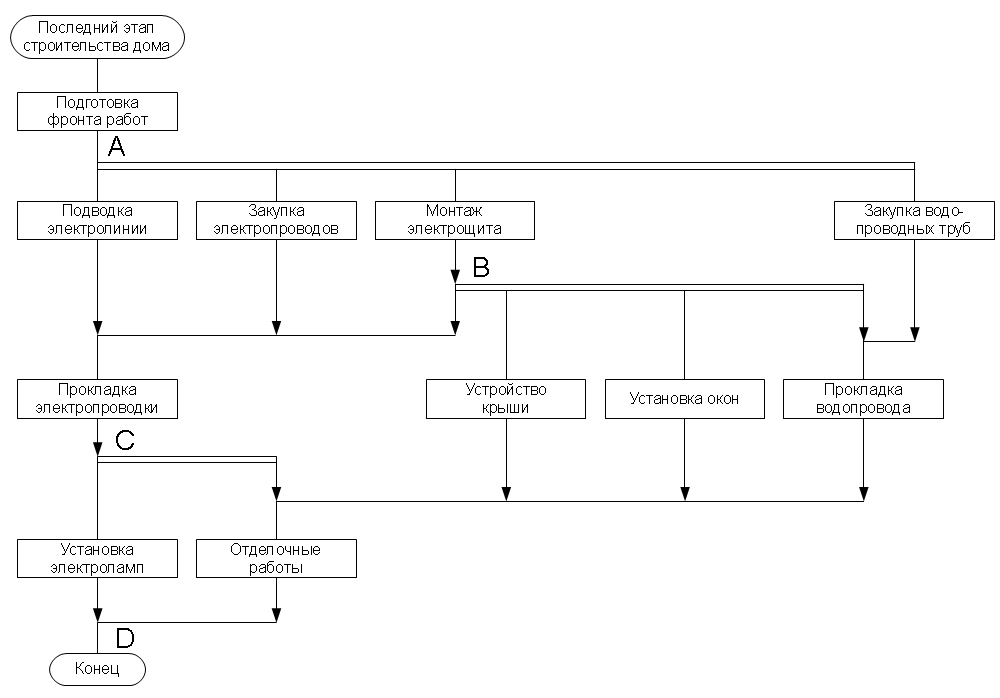 А вот нижняя стрелка обозначет окончание группы параллелных процессов ("Подводка электролинии", "Закупка электропроводов", "Монтаж электрощитка"), после которых можно приступить к "Прокладка электропроводки".