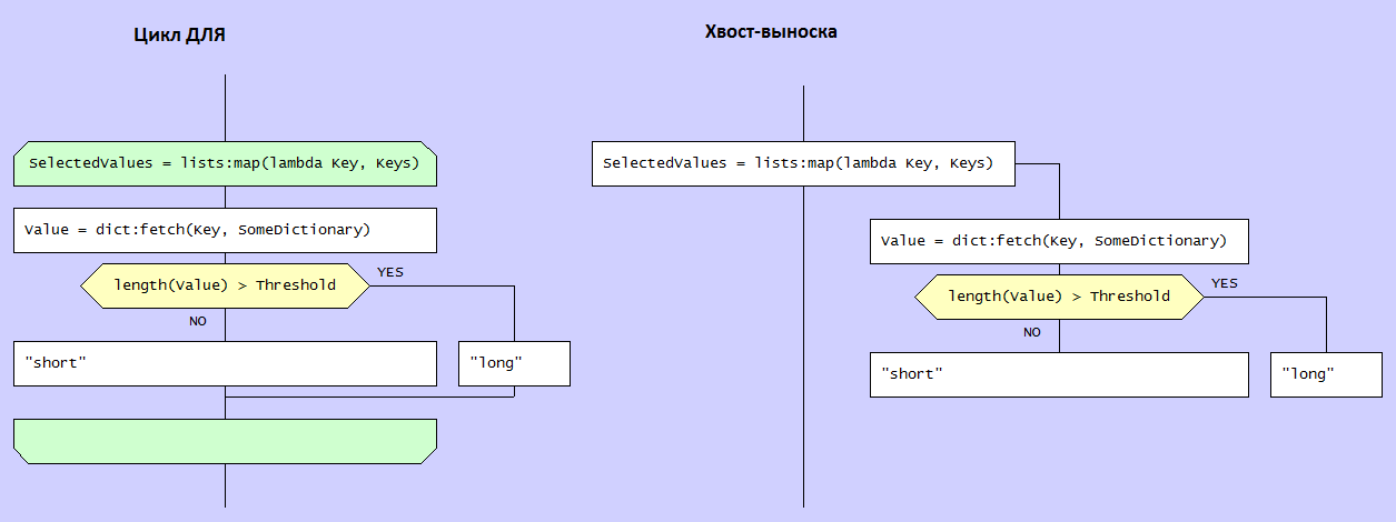 С другой стороны, иногда всё-таки лямбды не подразумевают цикл. Тогда стандартные циклические макро-иконы ДРАКОНА будут сбивать читателя с толку. Именно по этой причине я и предложил ввести дополнение в ДРАКОН (хвост с правой стороны иконы ДЕЙСТВИЕ).