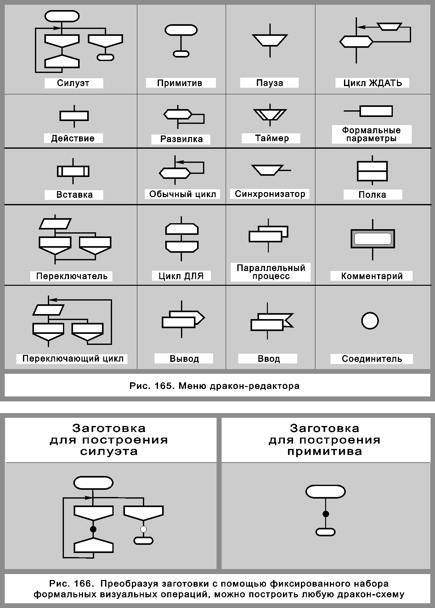 МЕНЮ И ЗАГОТОВКИДракон-редактор имеет меню графоэлементов (рис. 165).