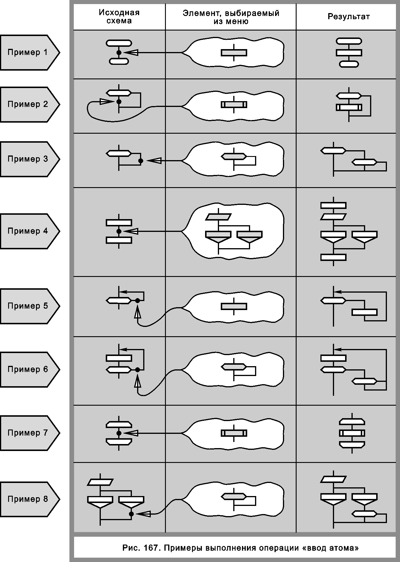 Операция «ввод атома» показана на рис. 167. Операция выполняется в два этапа: сначала пользователь выбирает нужный атом из меню, затем обращается к дракон-схеме и указывает точку, в которую нужно его ввести.