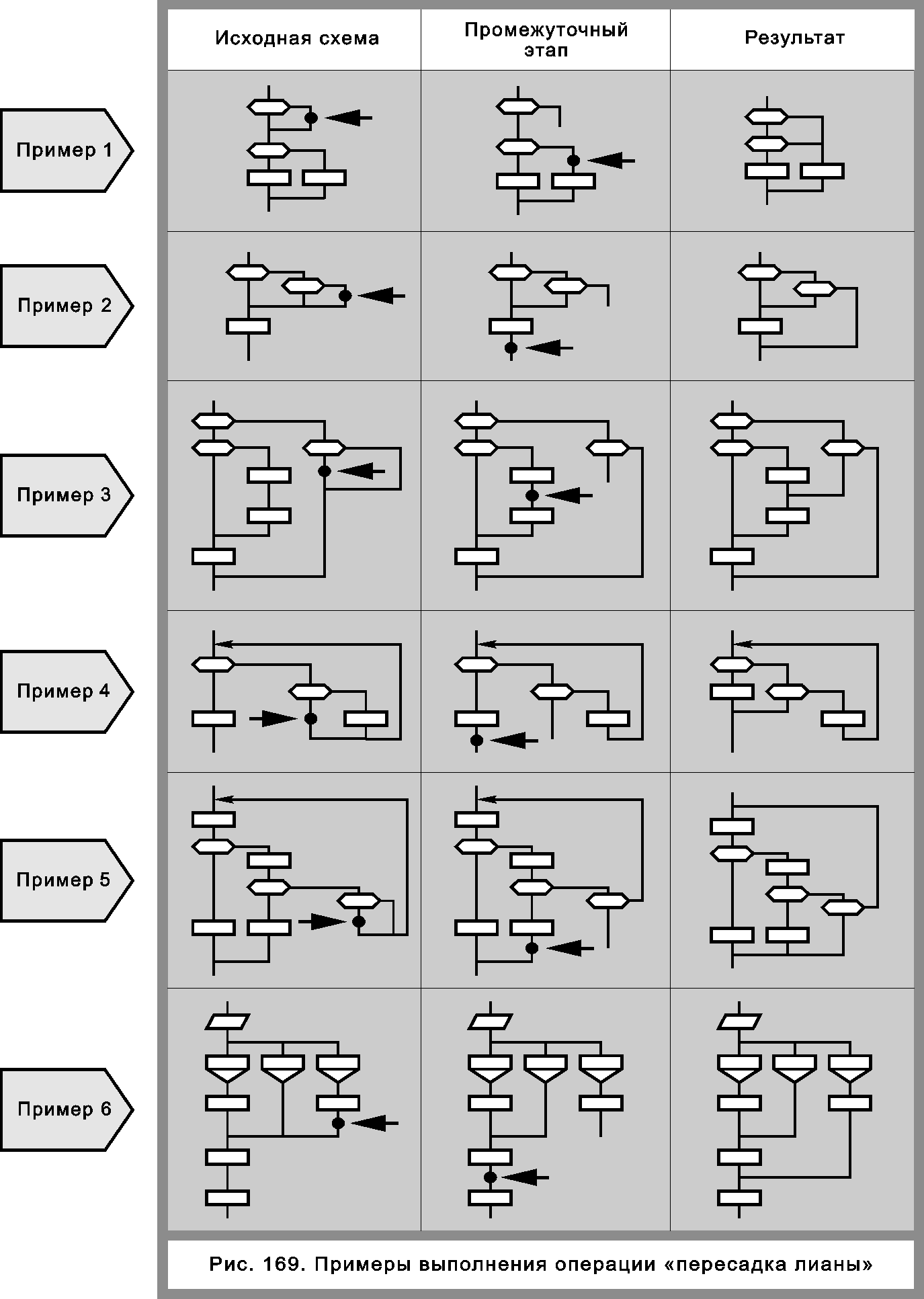 Выполнение этой операции осуществляется в два этапа. Сначала курсор подводится к нижнему концу лианы, который надо освободить (рис. 169, левая графа). Но куда его присоединить? Пользователь выбирает желаемую точку и отмечает ее курсором (рис. 169, средняя графа). Результат операции «пересадка лианы» показан на том же рисунке в правой графе.