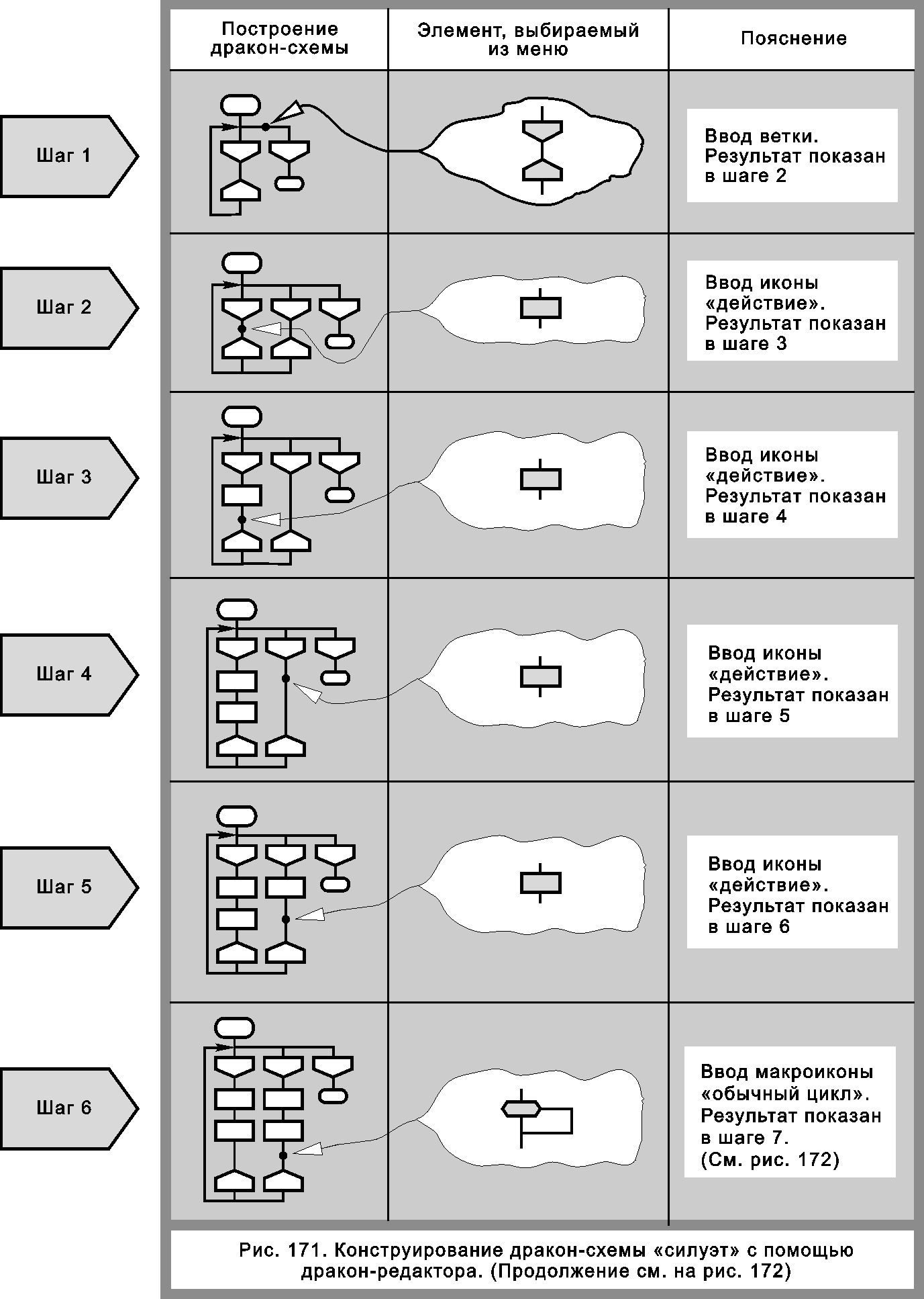 Дальнейший ход строительства ясен из рисунков 171 и 172. В шагах 2—5 вставим 4 иконы «действие». В шаге 6 вставим макроикону «обычный цикл». Результат виден на рис. 172, шаг 7, слева.