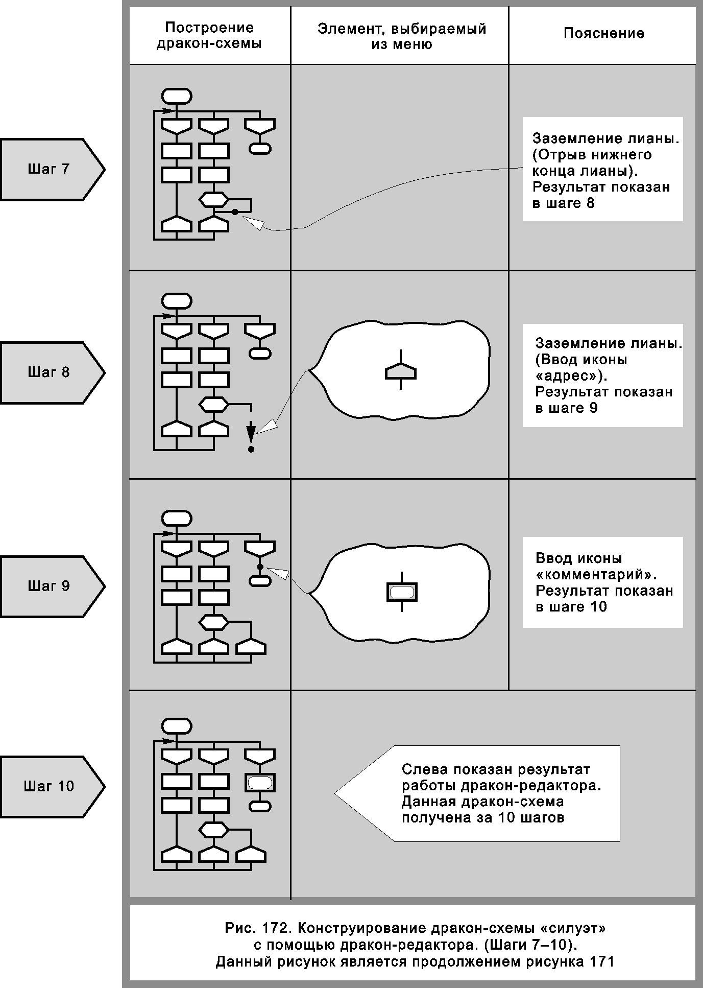 Два следующих шага выполняются аналогично. В дракон-схему последовательно вводятся две иконы «действие» (рис. 168, шаги 3 и 4).