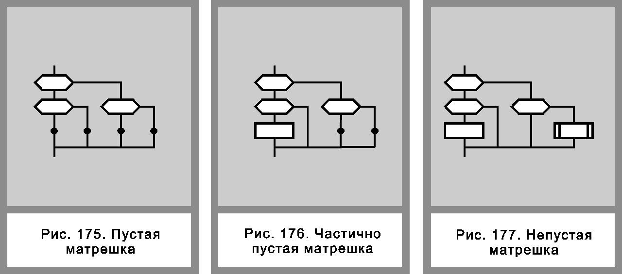 Тезис 23. Матрешка бывает пустой (если все содержащиеся в ней атомы пустые), частично пустой (если в ней есть как пустые, так и непустые атомы) и непустой (если все ее атомы непустые). См. рис. 175—177