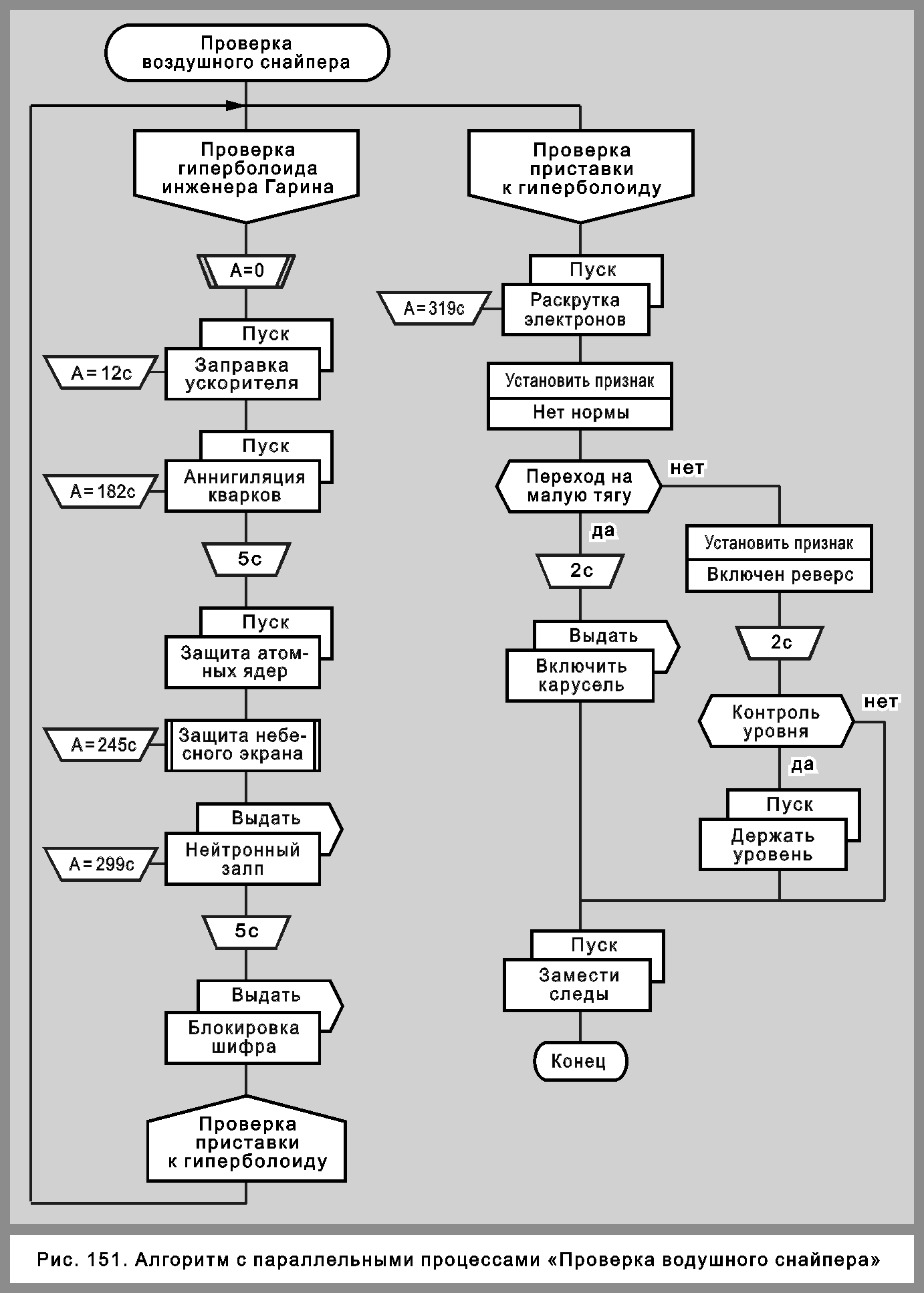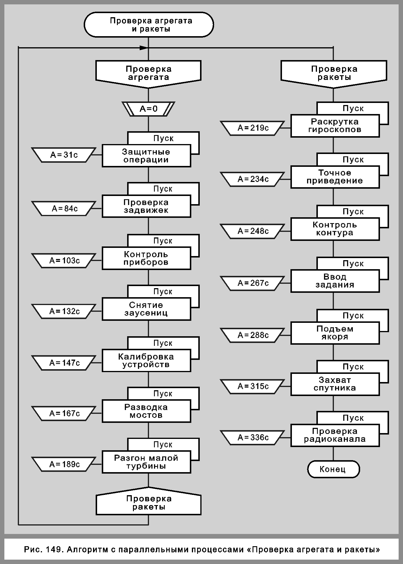 В АЛГОРИТМЕ «ПРОВЕРКА АГРЕГАТА И РАКЕТЫ»На рис. 149 изображены 15 параллельных процессов: