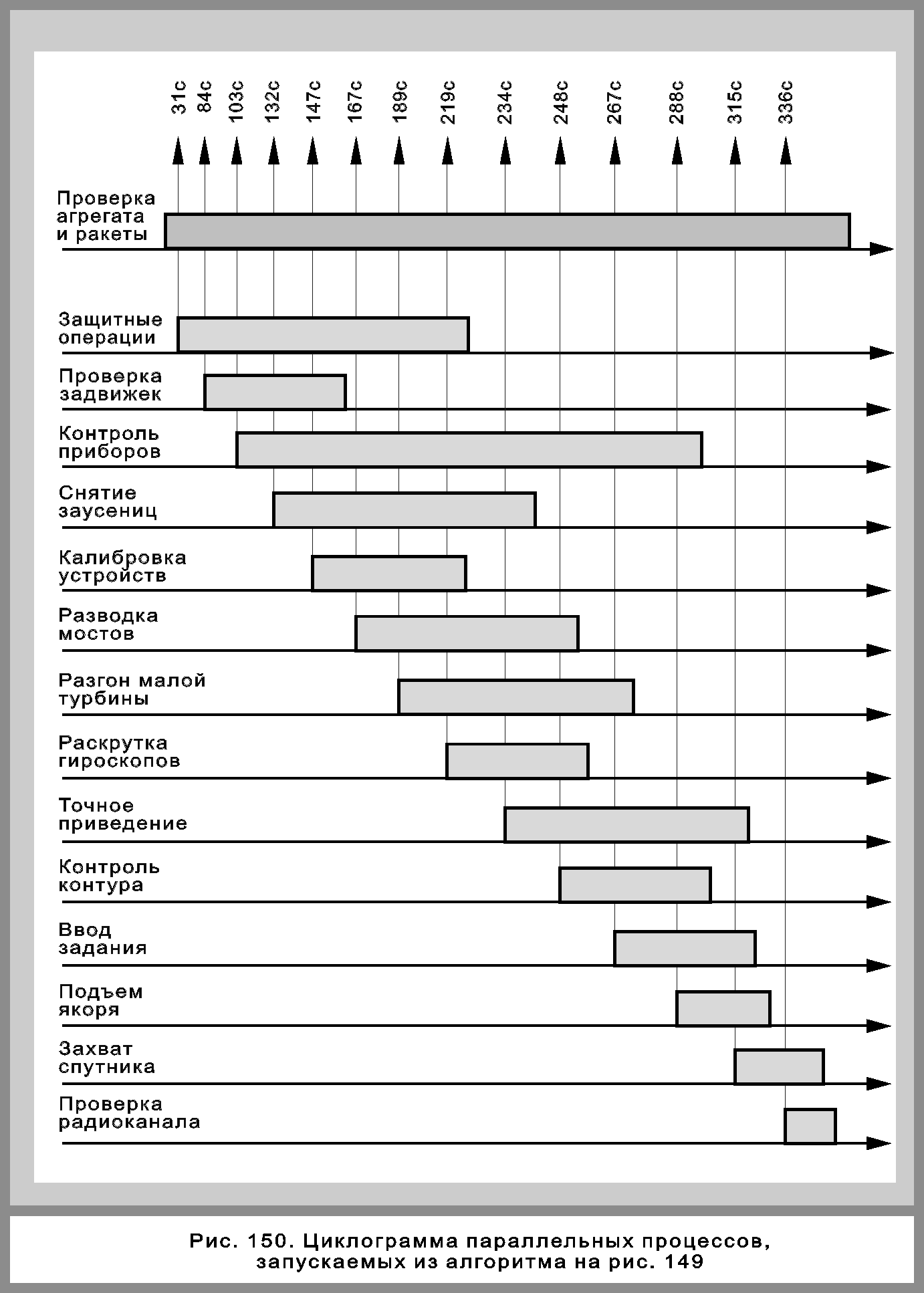§3. ВРЕМЕННАЯ ДИАГРАММА ПАРАЛЛЕЛЬНЫХ ПРОЦЕССОВНа рис. 150 показана временная диаграмма, иллюстрирующая алгоритм на рис. 149. В верхней строке темным цветом выделен вызывающий алгоритм. Он имеет самую большую длительность. Ниже расположены вызываемые процессы.