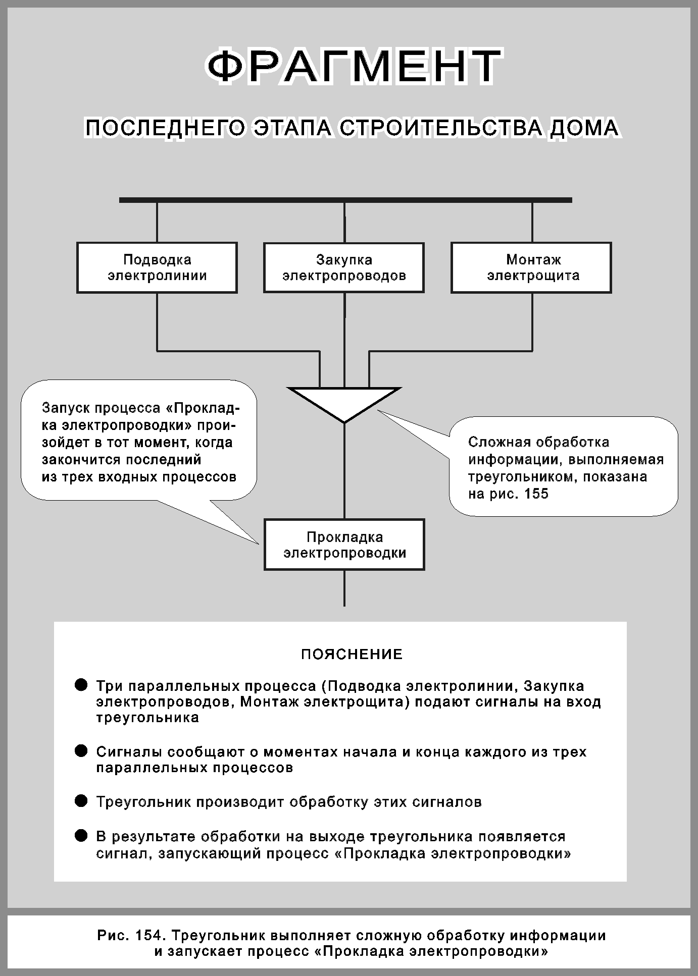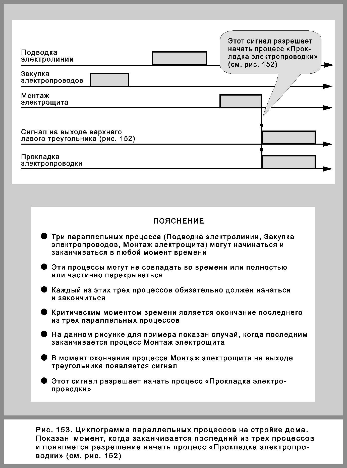 В этом случае окончание процесса «Монтаж электрощита» разрешает начать процесс «Прокладка электропроводки», как показано на рис. 153.