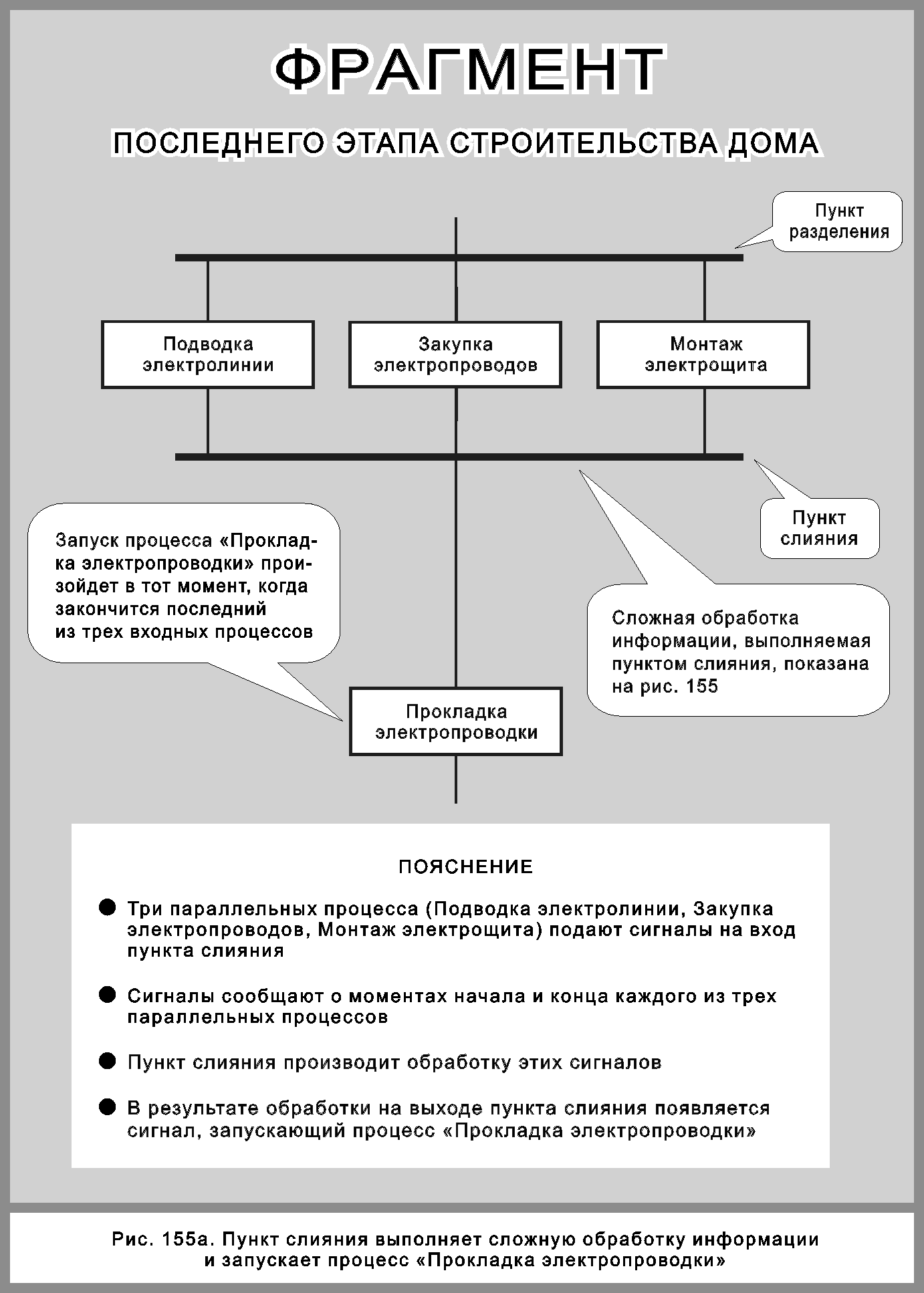 Дальше вторая ветка работает аналогично первой. Когда вторая ветка определит, что три процесса закончились (см. точку Z на рис. 155), производится Пуск процесса «Прокладка электропроводки».