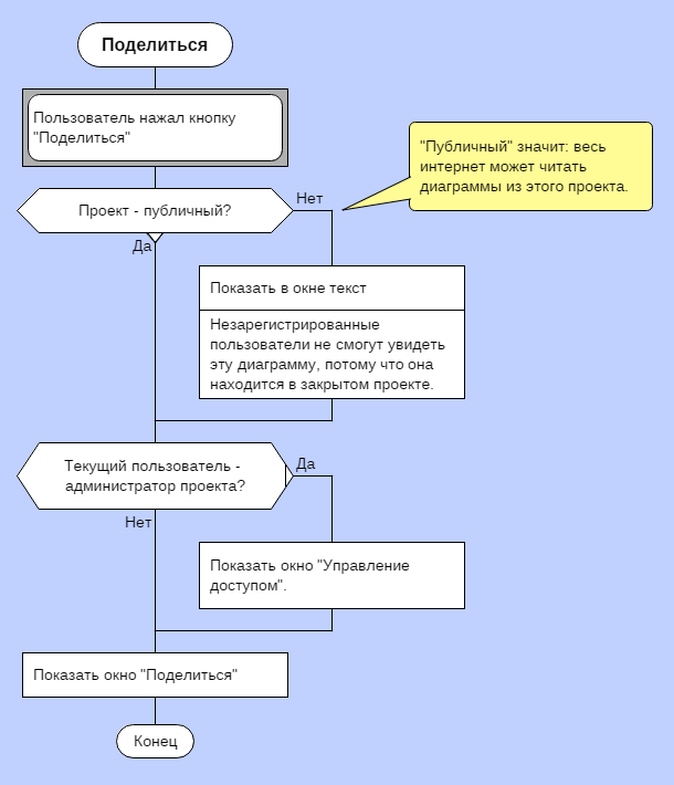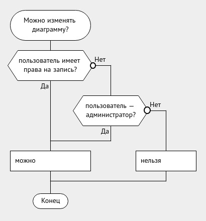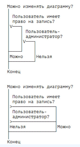 Есть предложение. В иконке "Вопрос" выход "нет" дополнять кружочком. Типа, знак инверсии, как на УГО логических элементов. Это улучшит читаемость схемы, - не надо вникать в текст "да" или "нет".