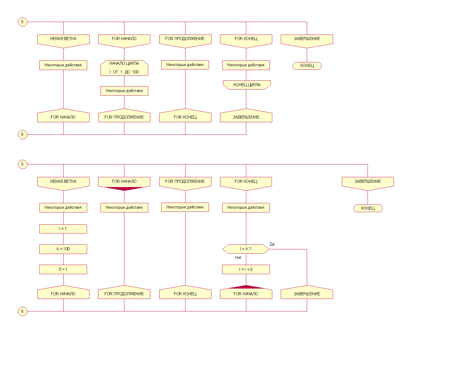 Эдуард "графитно" объяснил всё за меня. Ваши ответы ему я также принимаю. И вот из них следует одна вещь - если многоветочный ДЛЯ допускаем, то должны ориентироваться не только на топологию схемы, но и на текст (в данном случае - на совпадение меток в вершинах-границах такого цикла). Т.е. у нас эти вершины становятся аналогами вершин-границ веток. И если Имя ветки не составляет пару следования с Началом ДЛЯ (между ними есть хотя бы одна вершина) - и/или то же имеет место с вершинами Конец ДЛЯ и Адрес ветки - то именно в этом случае можно говорить о передаче управления, минуя петлю силуэта. В противном случае, как я уже говорил, можно считать соответствующую пару икон "укрупнённым началом/концом ветки", одновременно начинающим/оканчивающим цикл. Но тогда тут справедливо повторяли - зачем такие сложности? Ведь можно использовать веточный цикл... который кроме того, исключает необходимость в зрительном поиске перехода сразу по двум категориям адресов - имён веток и имён переменных многоветочных ДЛЯ.