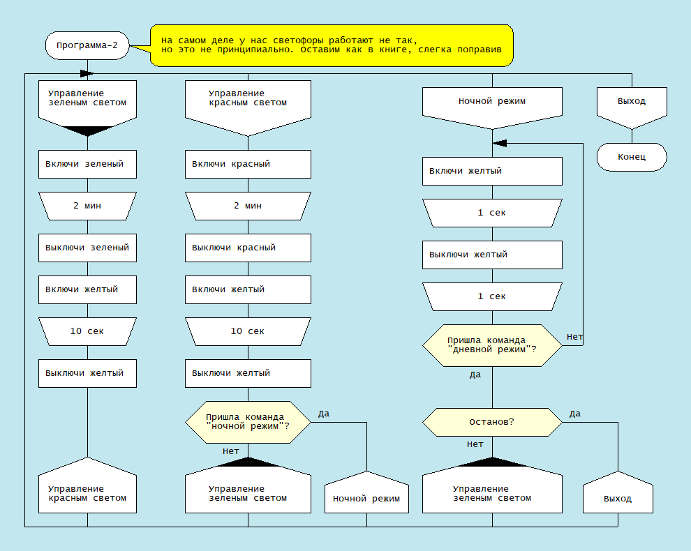 Данную пару диаграмм я представил нескольким своим коллегам, и не только коллегам, причем среди них были и программирующие, и нет, и общее мнение было единодушное: Вторая схема не проясняет алгоритм, а скорее запутывает. Общий принципы перечисления сопоставимых по контексту команд во второй схеме нарушен, т.к. команды управления светом чередуются с командами управления временем, к которым опять привязаны команды управления светом. В общем, не вариант.