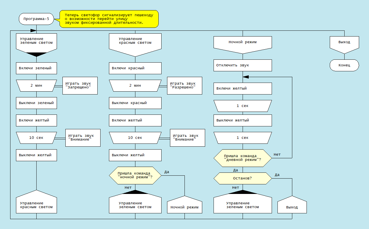 Расширим функционал устройства: наш светофор мы дополняем новыми лампочками для пешеходов, просто правильно перекоммутировав световые приборы, изначально не меняя алгоритм. Но при этом у нас возникает необходимость подавать звуковые сигналы для слабовидящих пешеходов. Звуковые сигналы имеют нужную длительность, равную времени работы световых приборов. Значит - исправляем алгоритм, дополняя его новыми иконами.