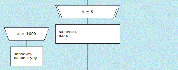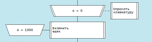 Возможно вариантом стало бы присоединение к иконке таймера новой иконы, указывающей, какая подпрограмма будет запускаться синхронизатором во время ожидания заданного временного порога. В приведенных примерах в синхронизаторе выражение "А = 1000" означает, что "Ждем до 1000 мс от начала отсчета".