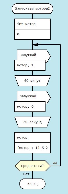 После нажатия кнопки пуск запускается мотор1 через час мотор 1 выключается, выдерживается пауза 20 сек и запускается мотор 2. И так они чередуются до бесконечности. Давайте построим алгоритм, и попробуем перенести из Дракона сразу в исполняющую машину?