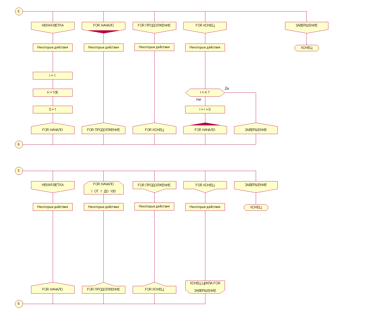 В иконе Начало цикла ДЛЯ на первой строке пишем (если можно) однобуквенный идентификатор цикла, например К. (Про остальные строки я умалчиваю)