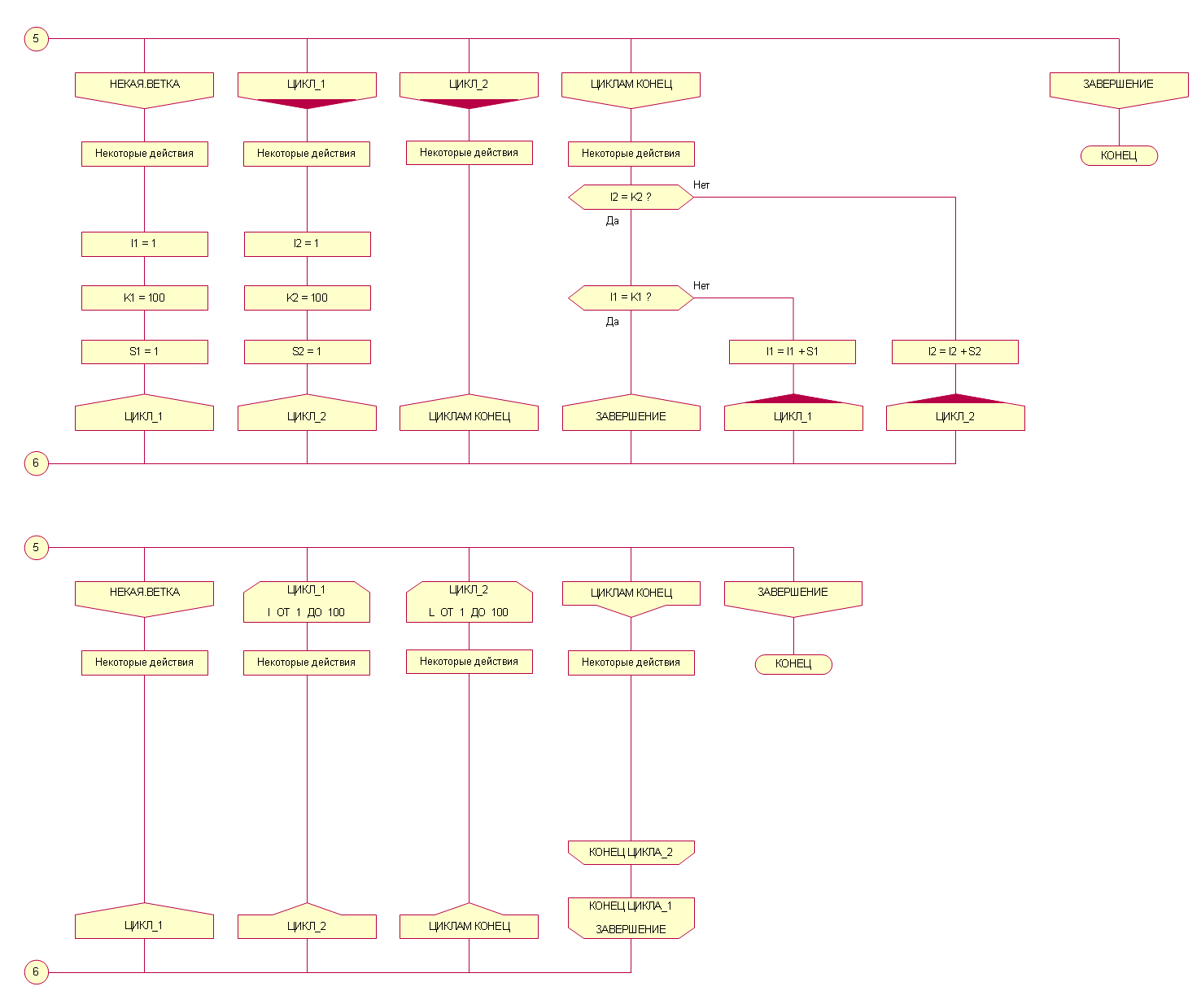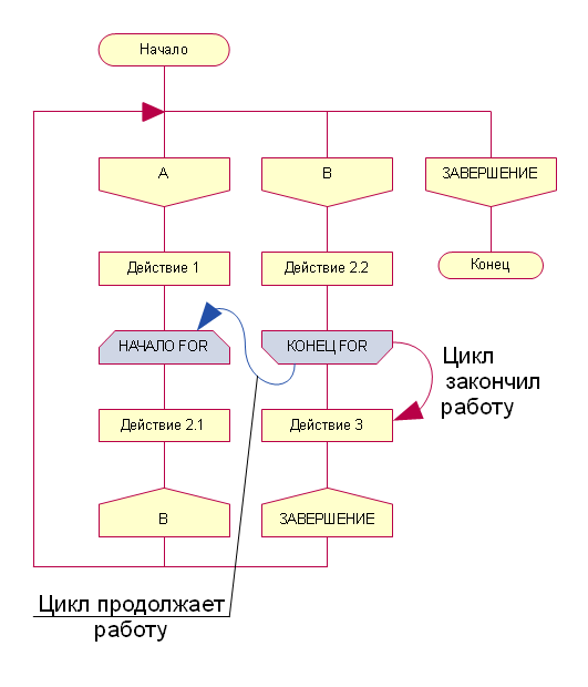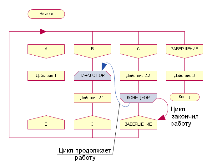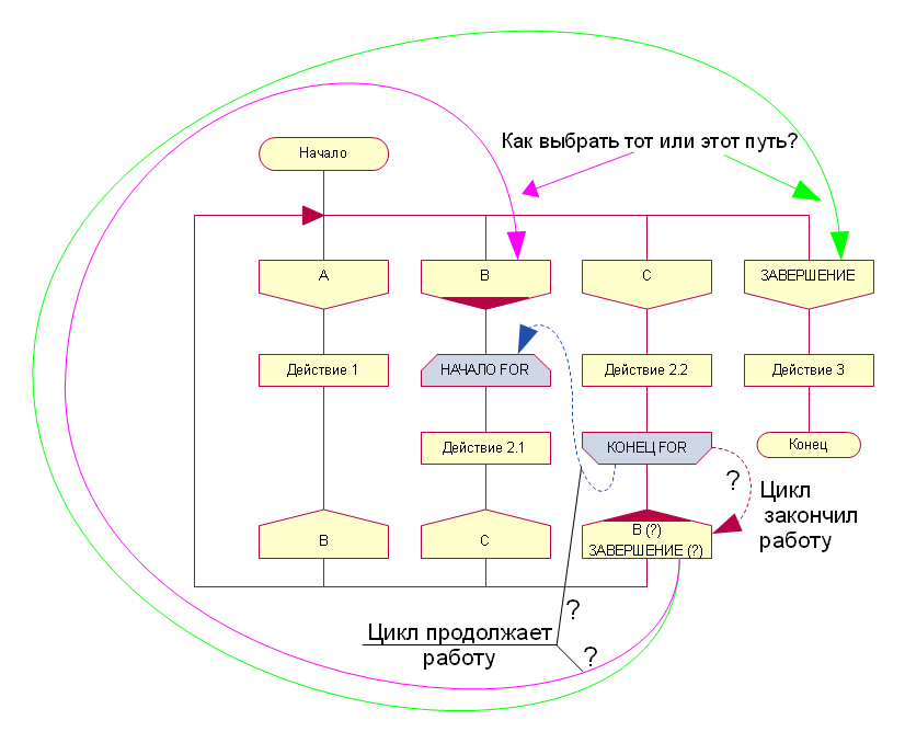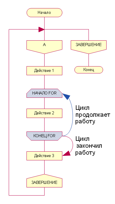Интересно, как будет выглядеть подобная схема с тремя циклами FOR, один из которых будет вложен в другой. Удастся ли легко понять, какой конец FOR относится к какому началу, и какой цикл вложен, а какой выполняется отдельно.