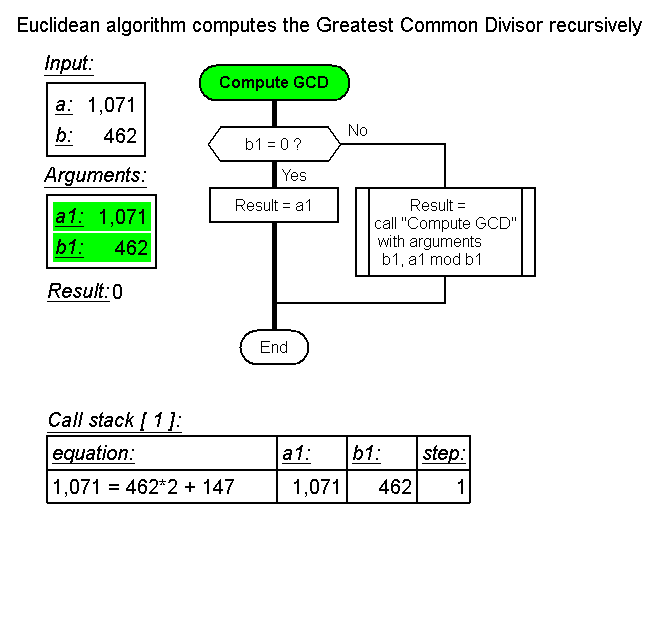 Алгоритм Евклида в рекурсивном исполнении: https://www.youtube.com/watch?v=M_wk2QxRM4w