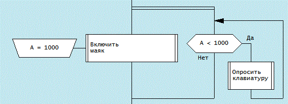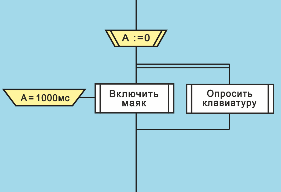 Правильно. И мне, как программисту, эта задержка не выгодна. Она тратит ресурсы впустую, что недопустимо. Пусть основная программа задерживается, а микроконтроллер за это время успеет еще что-то полезное сделать, например, "опросить клавиатуру", или "мигать светодиодом". Можно, конечно, данный алгоритм описать с помощью традиционных приемов языка Дракон, но тогда схема будет громоздкая, и понимания вряд ли станет больше. Что полезнее: Синхронизатор "Жди 5 секунд" или Синхронизатор "Жди пять секунд, помигивая светодиодом"?