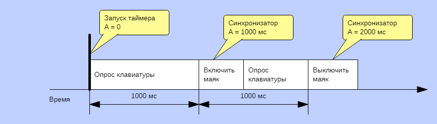 Через 1000 мс Включить маяк, а пока время не наступило, Опрашивай клавиатуру.