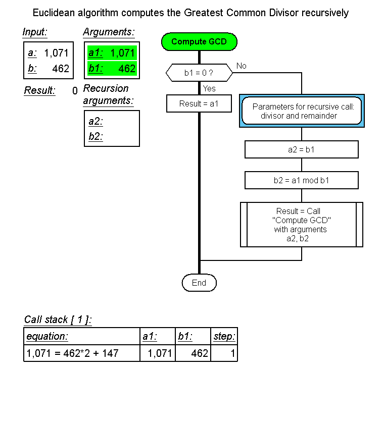 Многие наверно знают, что любой рекурсивный алгоритм можно представить в виде циклического алгоритма с использованием стека. По сути реализация рекурсии в языках программирования - это скрытое от программиста использование стека. Если использовать варианты алгоритмов использующих цикл, а не рекурсию, то проблем с отображением алгоритма не возникает и его можно отобразить используя существующие элементы Дракон-схем, без необходимости добавления какие-то новых элементов (различных стрелочек, жирных шрифтов, анимации и т.д.).
