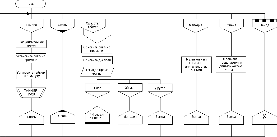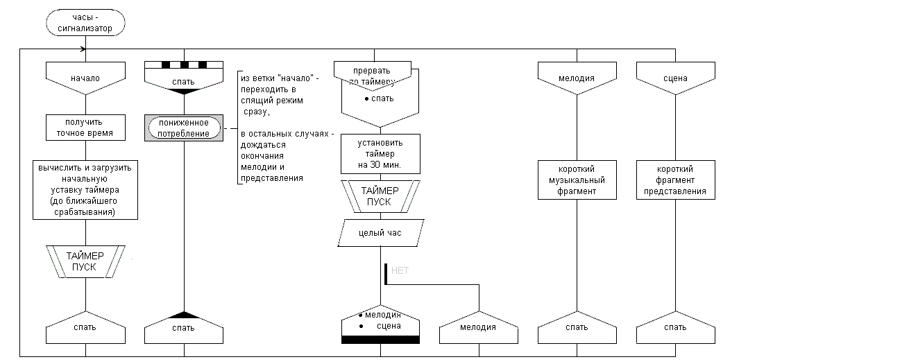 5. Таймер упомянут, но сам не показан. А ведь он фактически ещё один параллельный процесс. Если таймер реализован в железе, то его можно и не показывать, а если программный, да ещё нагружен некоторыми действиями, то его имеет смысл показать в отдельной ветке.