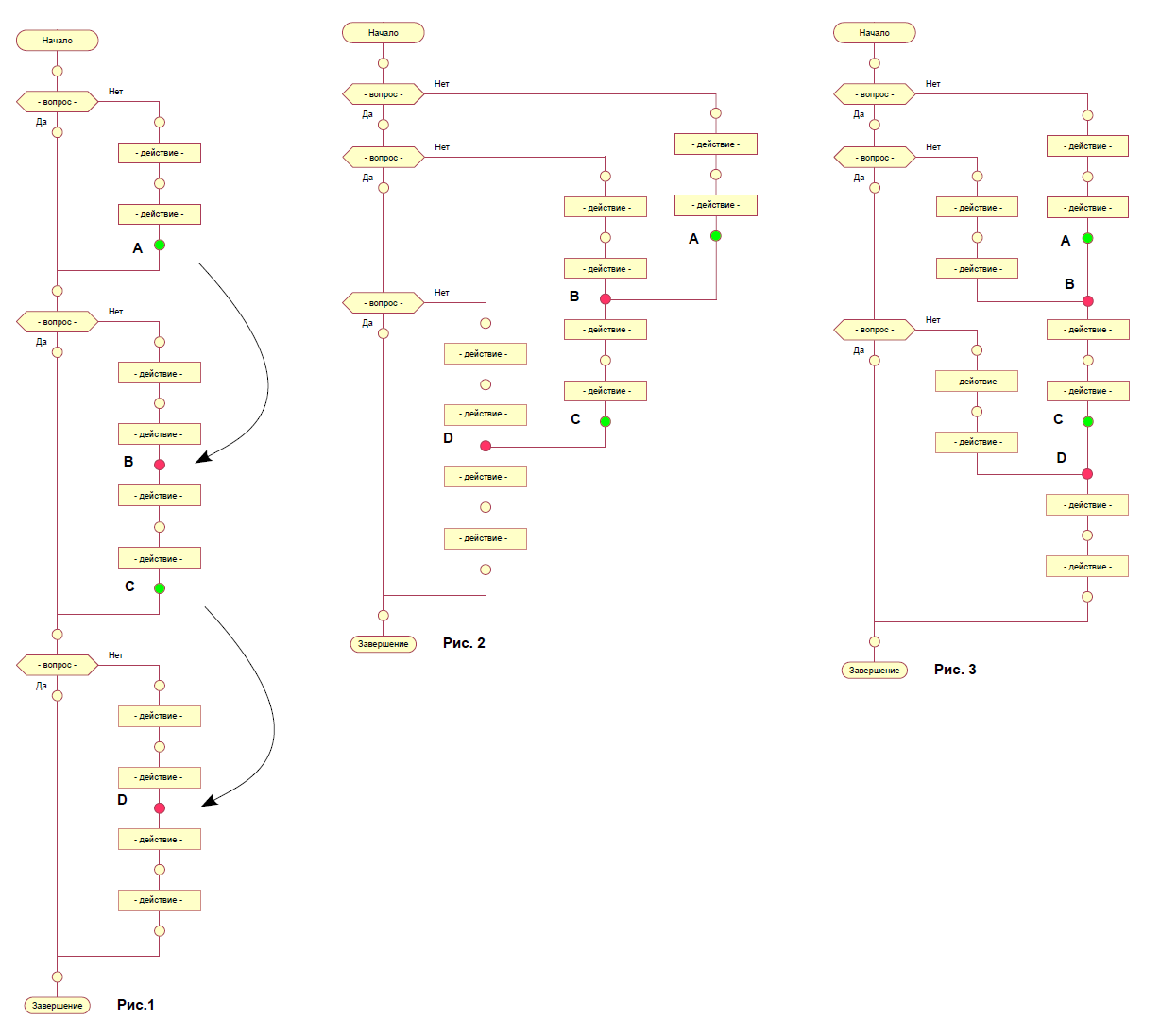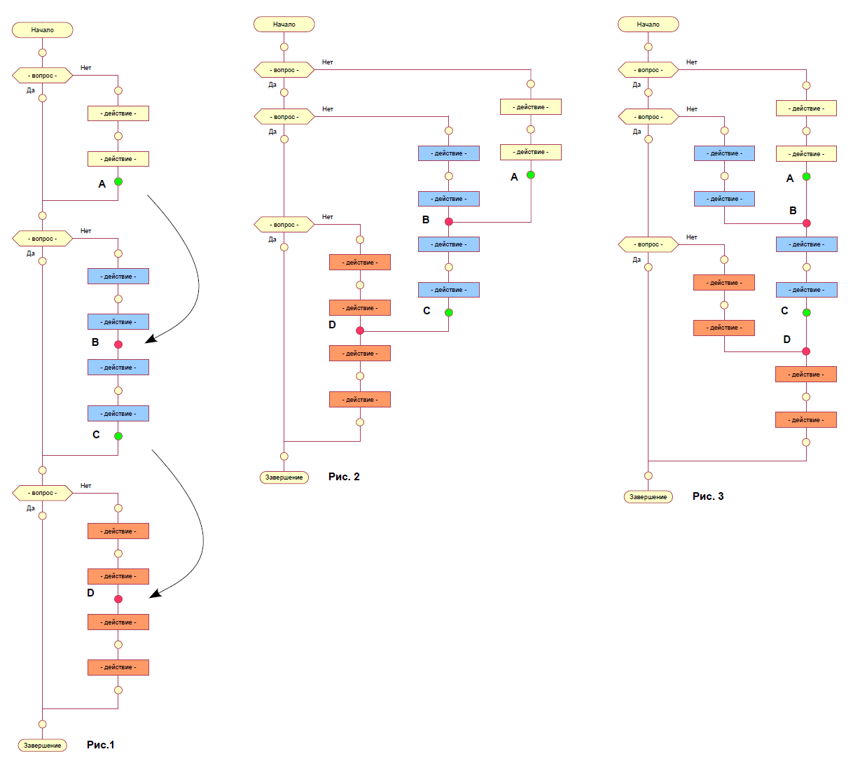 На Рис. 1 исходный алгоритм. На Рис. 2 один вариант расположения маршрутов. На Рис. 3 — другой вариант.