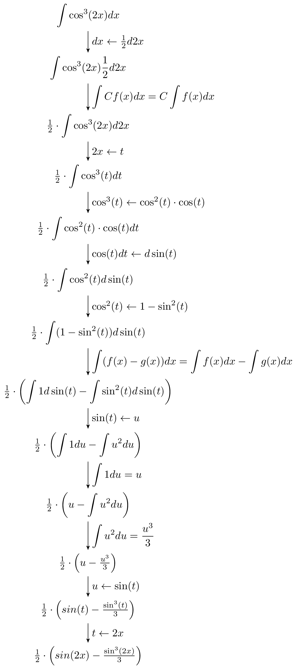 Как вам эта запись нахождения интеграла в виде графа? Ребра подписаны преобразованием, которое в данный момент совершается. Думаю развить этот пример и сделать ветви, чтобы было наглядно видно параллельные работы в мыслительном процессе.