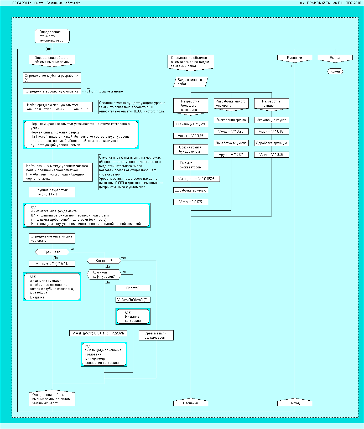 Комментарий к файлу: Образование. Схема родилась при участии друга - высококлассного сметчика в течении получаса - 45 мин. Он увлекся идеями ДРАКОНа и решил попробовать реализовать один из сложных расчетов нахождения стоимости земляных работ. Если бы сметное делопроизводство давалось бы в таких схемах, то качество обучения выросло бы на порядки. Обучение проводилось бы под девизом: "Смотрите - и увидите!"