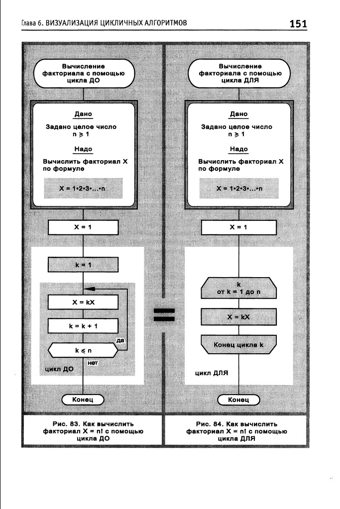Но в дракон-схемах на рис.83 и рис.84 не разобрался (смотрите прикрепленный файл). Конкретно не понял как вычисляется факториал на обоих схемах. Прошу помочь разобраться в данных дракон-схемах, а также если есть возможность дать другую дракон-схему с использованием цикла ДЛЯ.