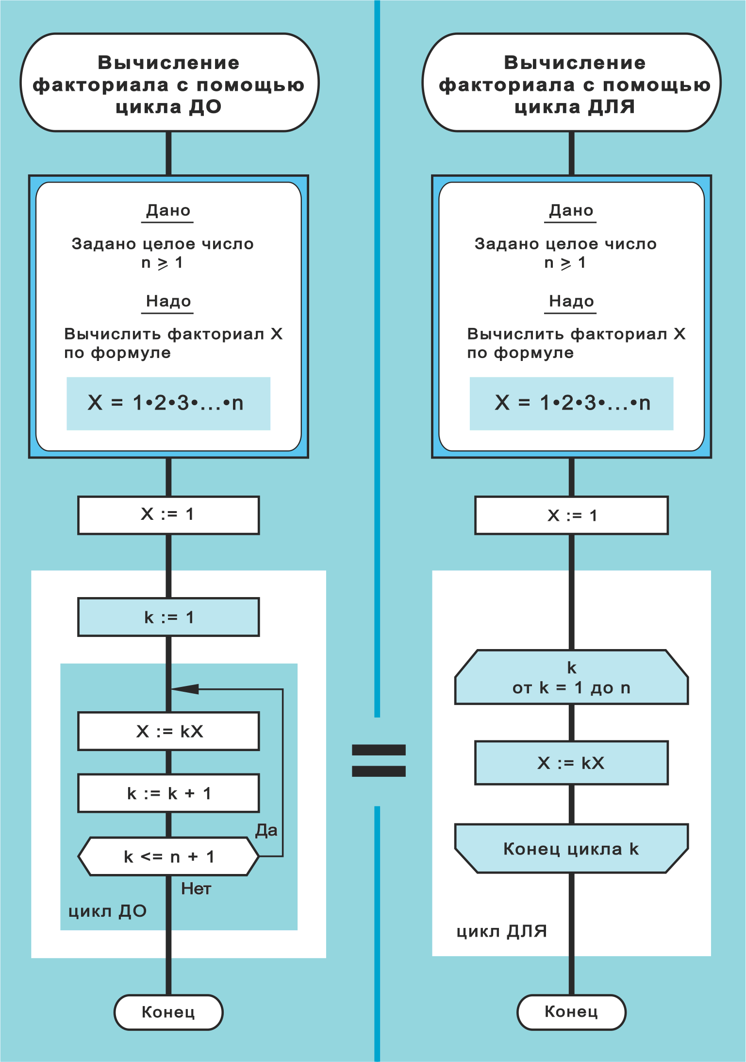 Этот момент я понял, они выполняют один и тот же алгоритм. Но я не разобрался как изображать алгоритмы подобным образом. Какую часть цикла ДЛЯ писать в иконе "Начало цикла", какую часть в иконе "Конец цикла" и какую часть располагать между ними. То есть не понятны конкретные функции каждой из икон.