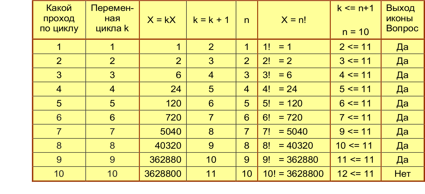 :idea: в конце 10-го прохода по циклу мы получим искомый результат X = 10! = 3628800.