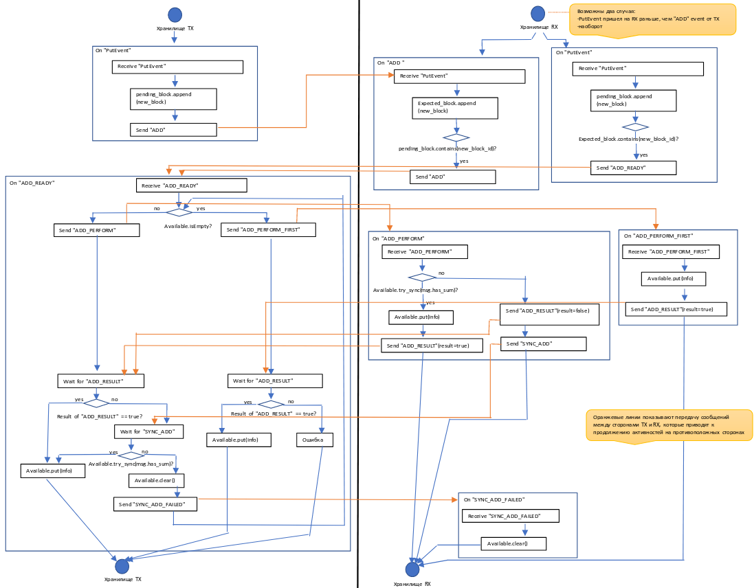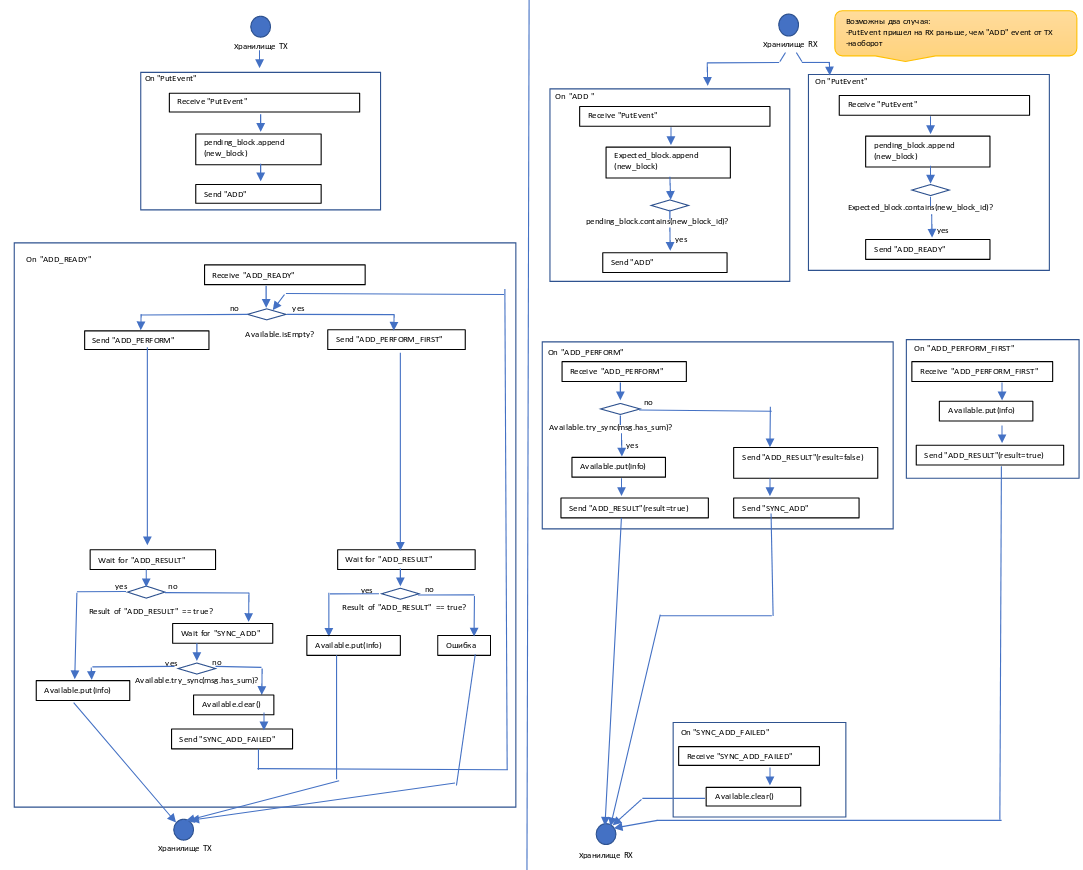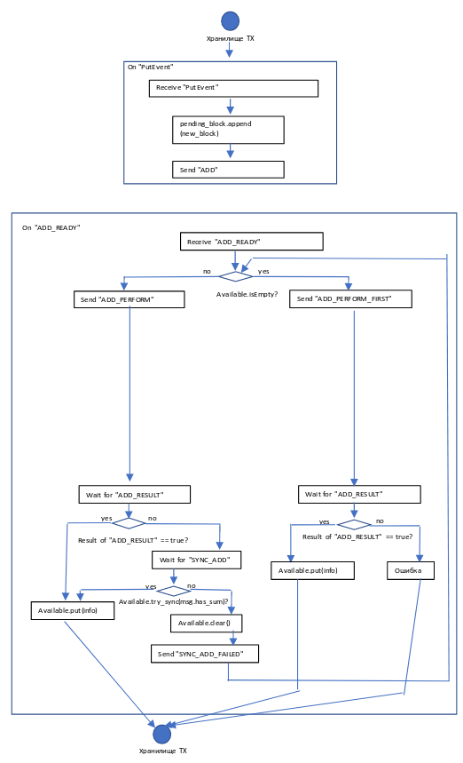 Есть продолжение в виде ДРАКОН схемы, освещающей часть работы - работу Хранилища TX. Выложу чуть позже.