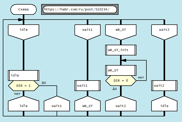 В сравнении, как мне кажется, становится понятна мощь ДРАКОНа: каждое действие очевидно, в отличие от графа, например, отсутствие инициализации в состоянии WR_ST, когда (DIR != 0).