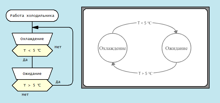 Я со своими учениками часто обдумываю варианты использования ДРАКОНа. Дошла очередь до использования графики для описания конечных автоматов. И с удовольствием замечу, что понимание довольно быстро появляется. С помощью диаграммы состояний можно выразить, например, логику работы холодильника. Мы описали работу простого холодильного агрегата и оформили схему на ДРАКОНе. Рассмотрели вариант описания с помощью композитного элемента "Гармошка".