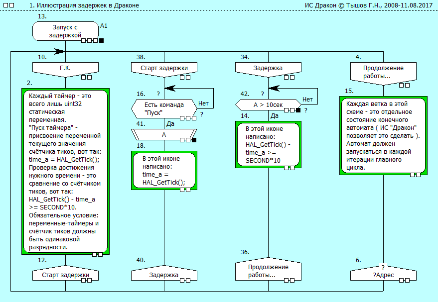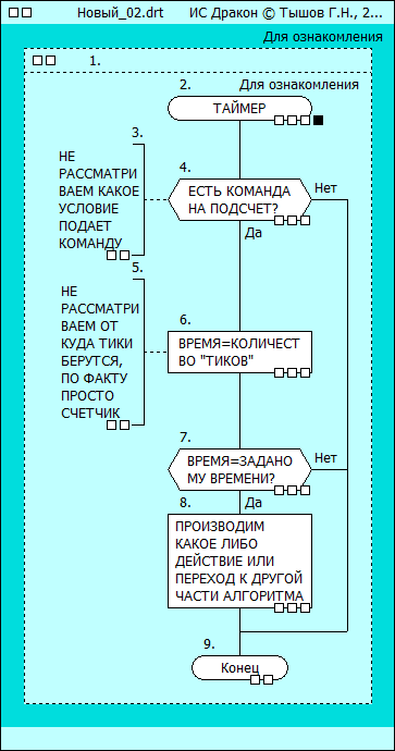 ВЫВОД ДЛЯ ДРАКОНА: ИСПОЛЬЗОВАТЬ ИКОНУ "ПУСК ТАЙМЕРА" НЕ ИМЕЕТ СМЫСЛА Т.К. ТАЙМЕР УЖЕ ЗАПУЩЕН НА ФИЗИЧЕСКОМ УРОВНЕ! ОСТАЕТСЯ ТОЛЬКО СЧИТАТЬ "ТИКИ" В НУЖНОМ МЕСТЕ АЛГОРИТМА