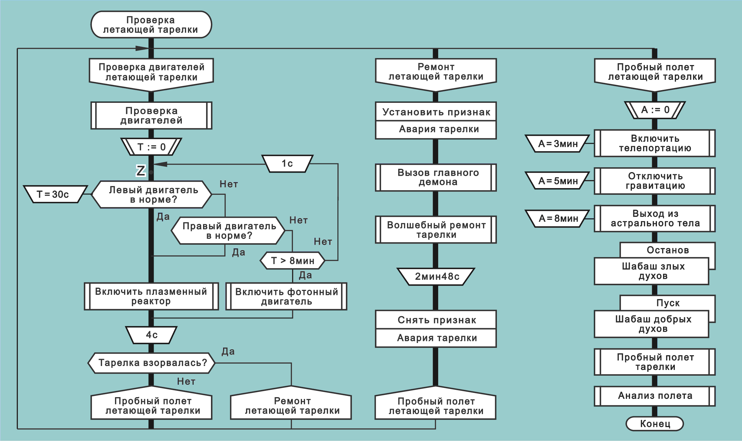 1) Почему проверка двигателей должна выполняться именно на 30-ой секунде? Получается, мы просто в начало работы алгоритма добавили паузу в 30 секунд? Какой в этом смысл? Может, стоит добавить простую икону "пауза 30сек" перед "проверкой двигателей"? И тогда можно перенести "сброс таймера T:=0" ниже. Ну, чтобы хотя бы обозначить "отсчитываем 8 минут вот от сих пор (от T:=0), и до сих (до T<8мин)".