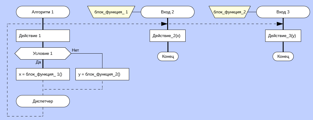 Но потом я понял, что такие дополнительные детали добавлять в язык не надо. Поясню. Вы ожидаете, когда пользователь нажмёт кнопку, в иконе Ввод. Этого события можно ждать год. Поэтому TAU говорит: рисуй пунктир! Покажи, что алгоритм здесь залипает! Владимир Ситников добавляет: хочу видеть, когда управление переходит диспетчеру! Покажи это на схеме!