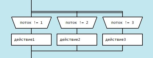 Задаем последовательно переменной значения очередности: "поток=3; поток=1; поток=2;", и получаем нужный порядок "Действие 3, Действие 1, Действие 2"