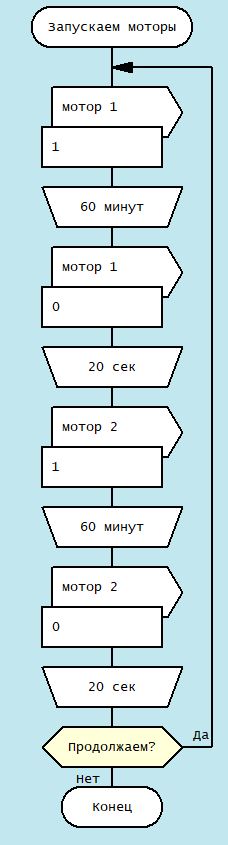 После нажатия кнопки пуск запускается мотор1 через час мотор 1 выключается, выдерживается пауза 20 сек и запускается мотор 2. И так они чередуются до бесконечности. Давайте построим алгоритм, и попробуем перенести из Дракона сразу в исполняющую машину?